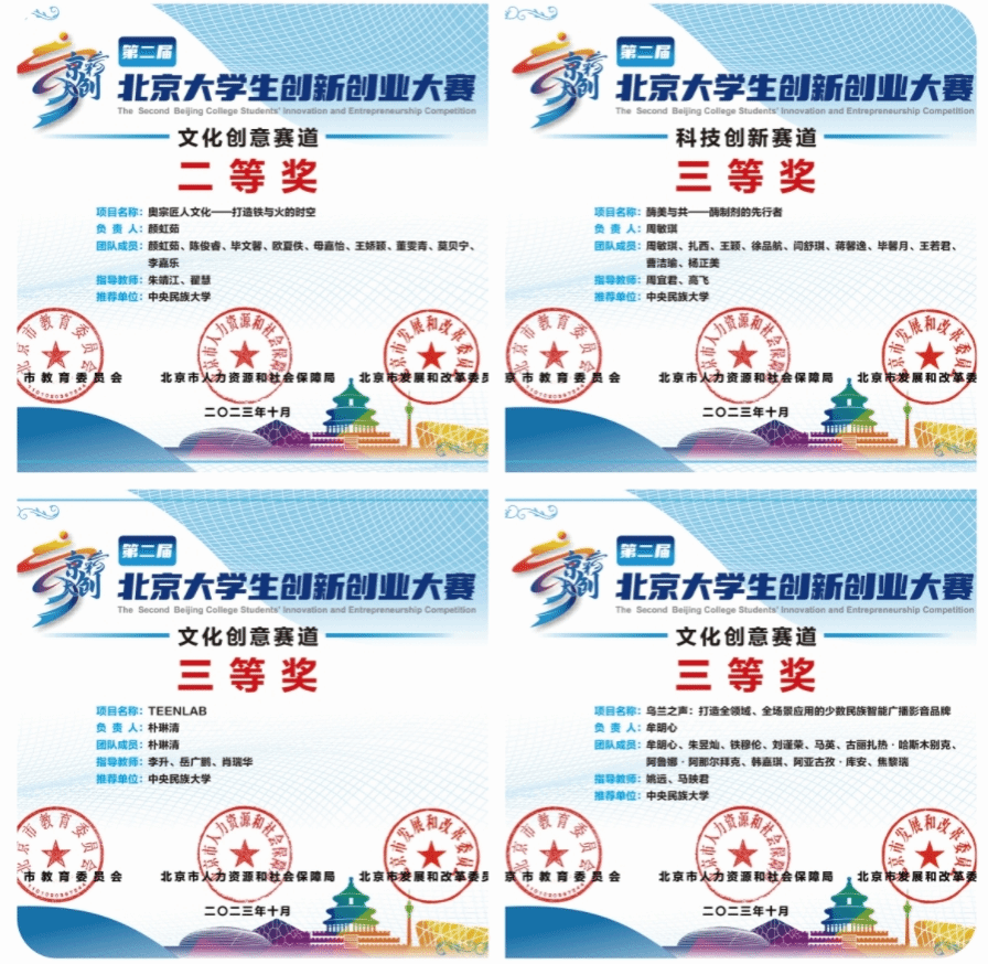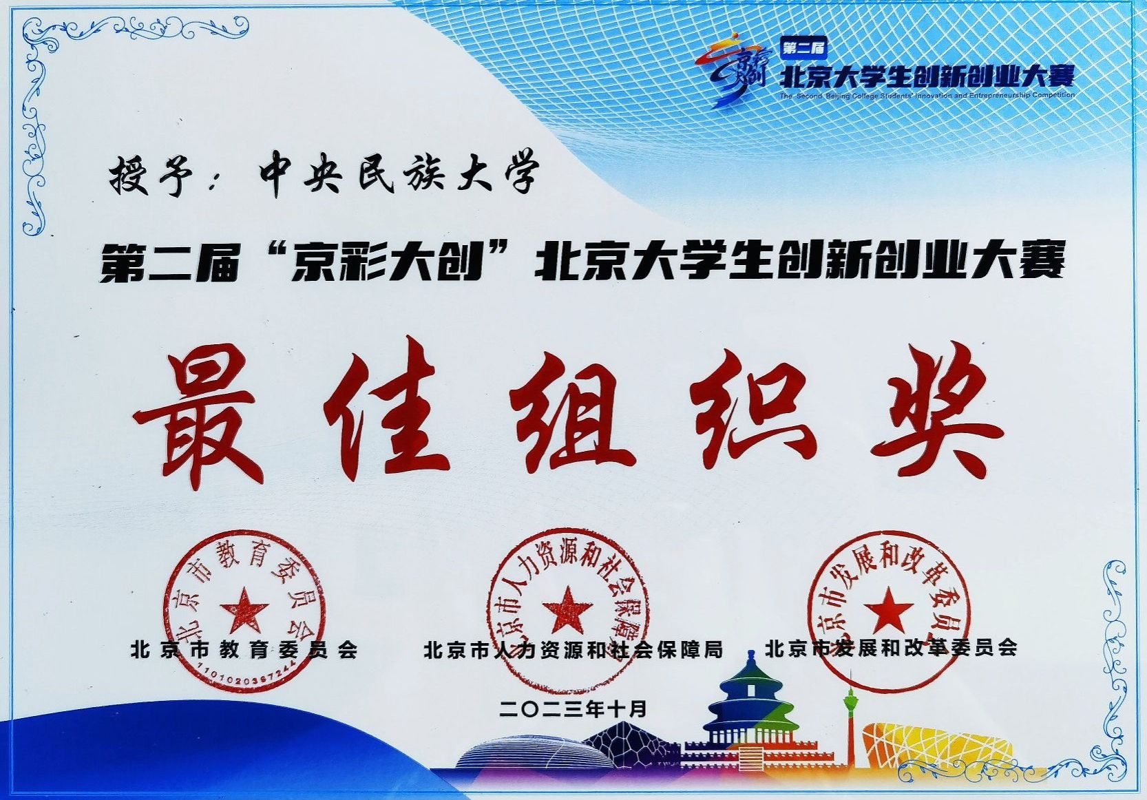 新闻网讯 近期,第二届“京彩大创”北京大学生创新创业大赛获奖名单公布,中央民族大学获评“最佳组织奖”,另外4个创业项目获奖,其中文化创意赛道二等奖1项、三等奖2项,科技创新赛道三等奖1项。