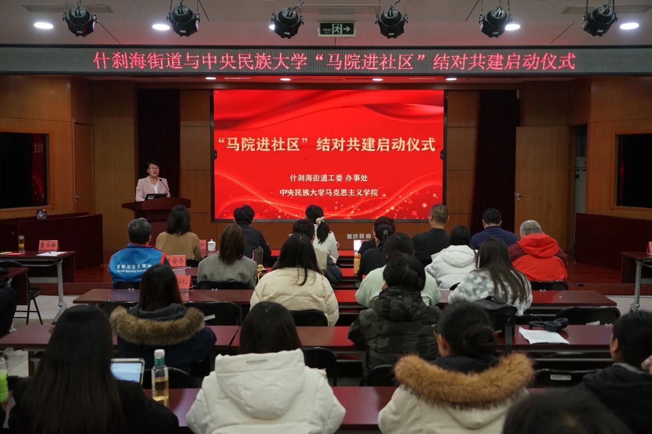 新闻网讯  为进一步推动党的创新理论深入基层,促进高校资源与社区实践精准对接,10月23日,中央民族大学马克思主义学院与什刹海街道“马院进社区”结对共建启动仪式成功举办。马克思主义学院副书记、副院长师英杰,什刹海街道工委书记陈璐,街道工委副书记、办事处主任时磊出席活动。仪式由什刹海街道工委副书记贾冬梅主持。