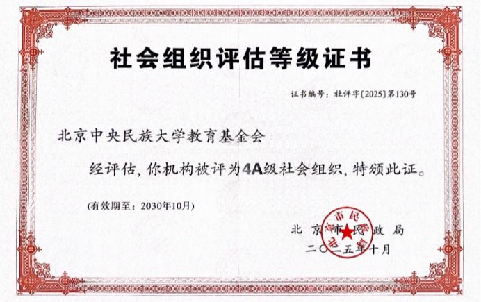 新闻网讯 近日,北京市民政局发布《关于2025年度市级社会组织评估结果的公告》(京民发〔2025〕57号),经过现场评估、评估结果评审、公示、复核以及市民政局确认,最终确定374个市级社会组织的评估等级。中央民族大学教育基金会在本次评估中获评“4A级社会组织”,这也是我校教育基金会继2021年获评4A等级以来,再次获得该等级的认定。