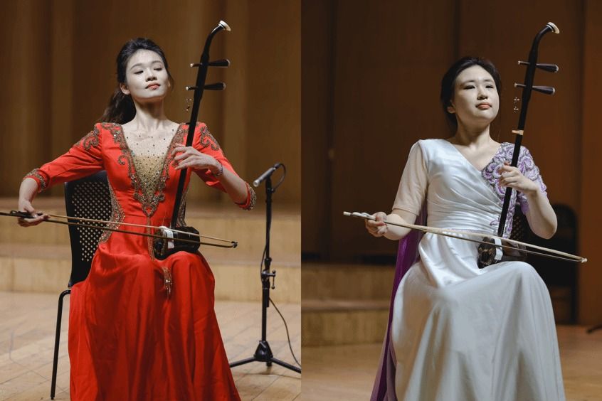 整场演出曲目丰富多元,兼具民族特色与创新表达,二胡二重奏《北京的金山上》、中阮独奏《幽远的歌声》、笙三重奏《冬猎》、筝二重奏《青峰赋》、扬琴独奏《古道行》、琵琶与马头琴联袂演绎的《穹纹·瓷鸣》、胡琴四重奏《打虎上山》、琵琶重奏《藏地谧境》、竹笛重奏《跑旱船》等演奏让观众沉浸式感受传统民俗的独特魅力。